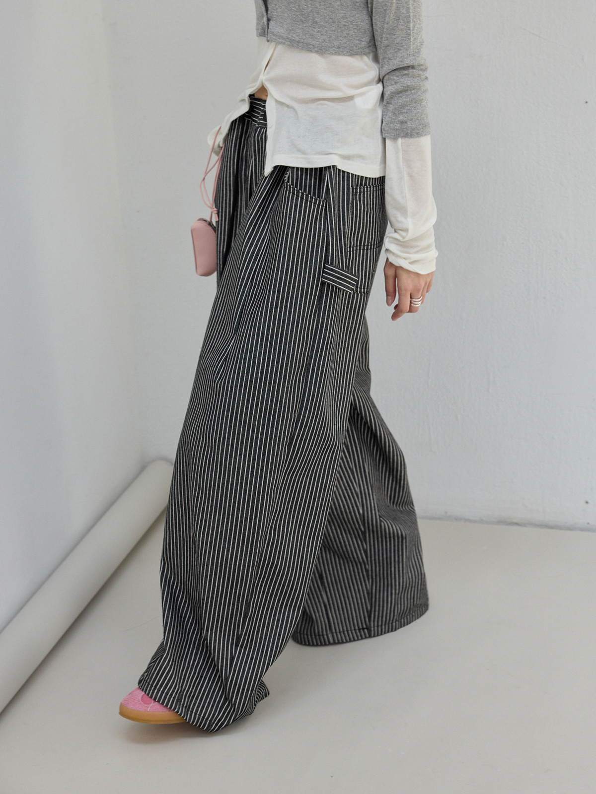 丹寧抽繩直紋打褶闊腿褲