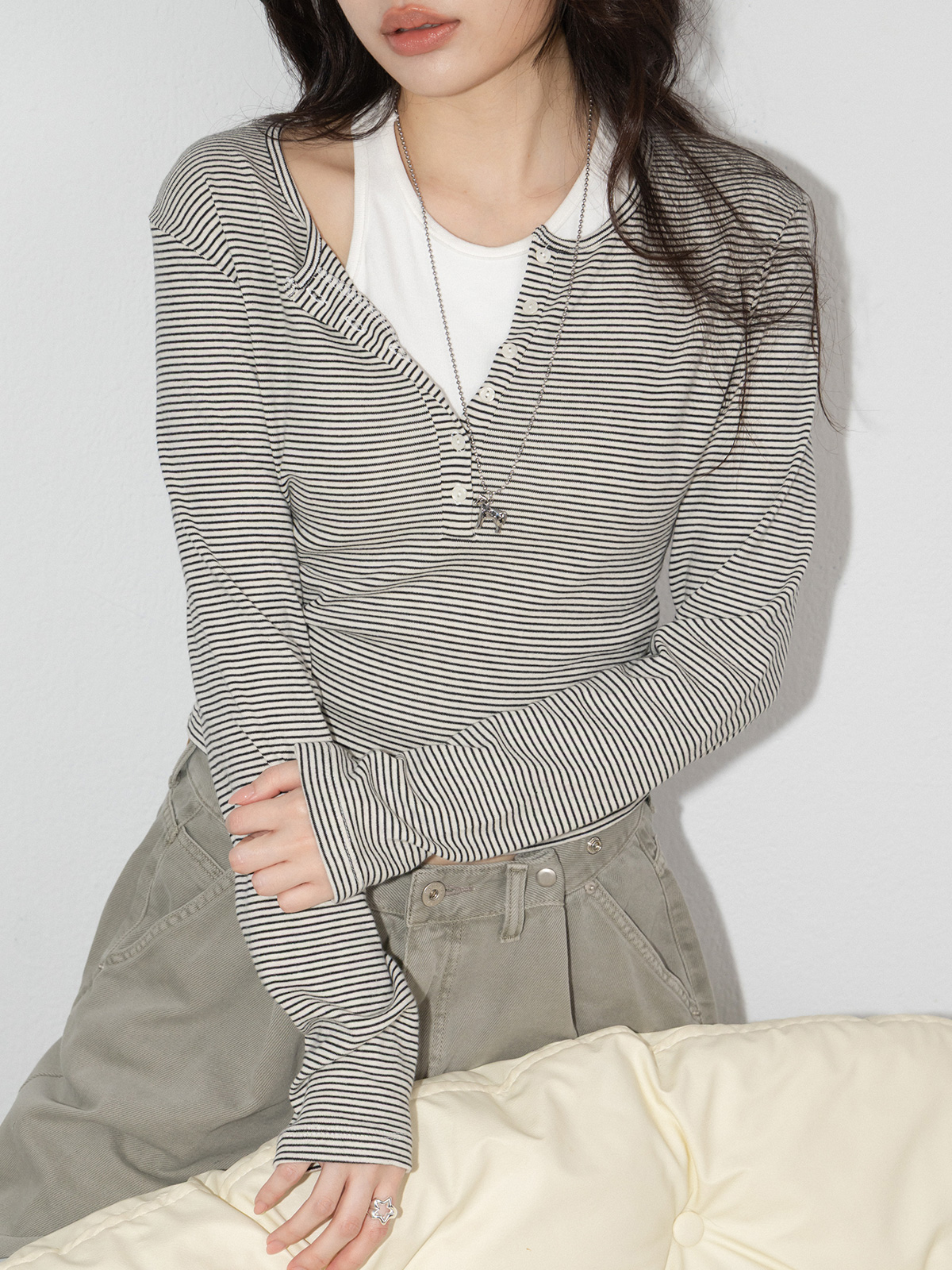 Basic排釦圓領條紋上衣