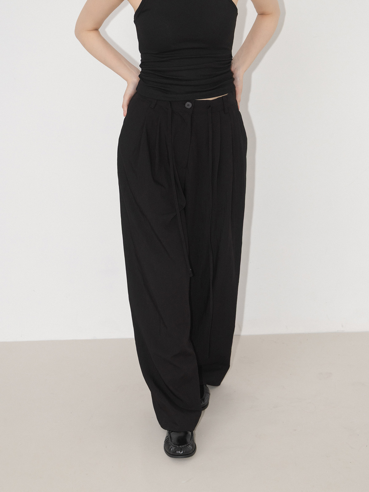 薄料腰抽繩打褶西裝寬褲