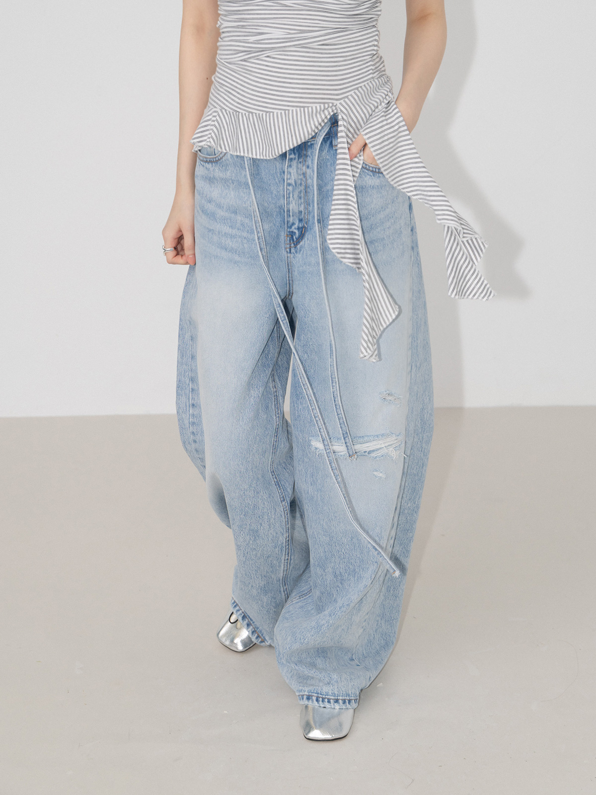 單膝割破刷淡綁帶牛仔褲
